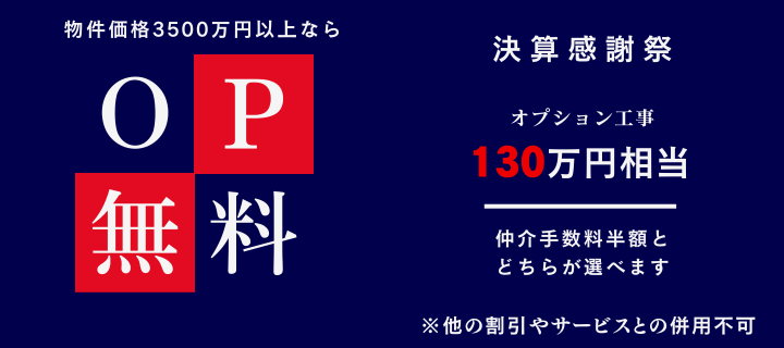 物件価格3500万円以上の場合「オプション工事6点サービス」と「仲介手数料半額」どちらかお選びいただけます