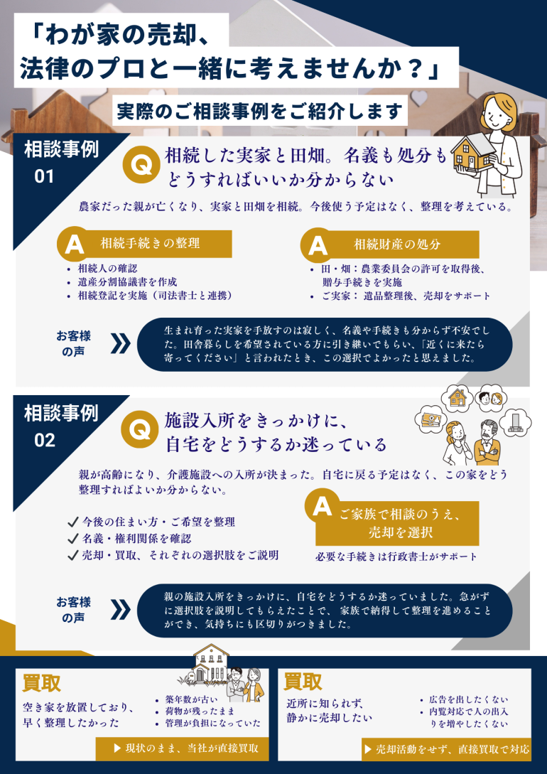 相続したご実家や空き家、 施設入所をきっかけにした住まいの整理など、 「何から始めればいいか分からない」という方に向けた内容です。